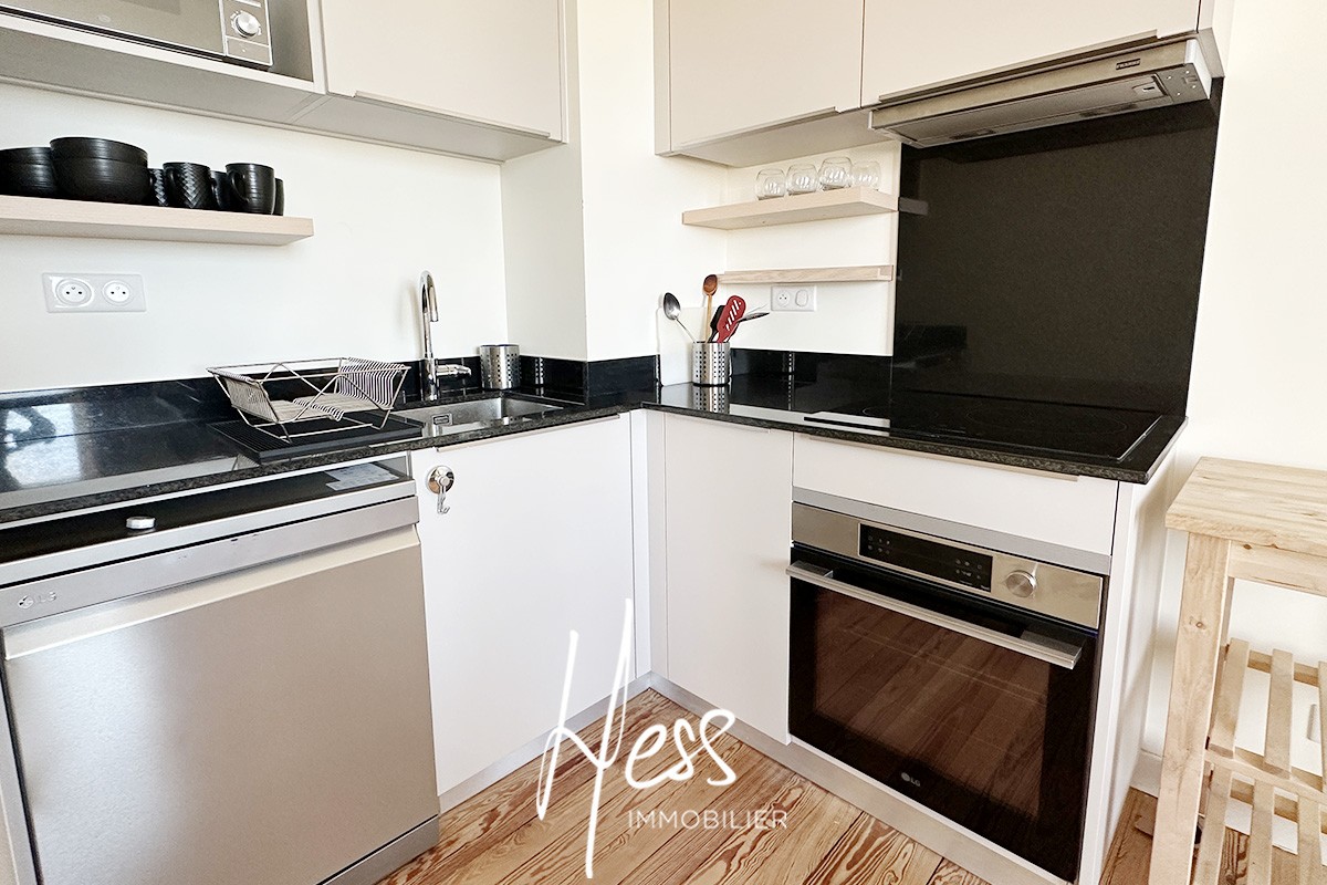 Magnifique pièce de vie : séjour - salle à manger avec une vue surplombant Schiltigheim ! Vue dégagée sur la Cathédrale.Très beaux volumes et belle lumière. Accès balcon exposé sud ! Cuisine ouverte et entièrement équipée : réfrigérateur, plaques, four, hotte, lave vaisselles. Deux chambres, chacune avec leur salle de bains privative. Toilettes séparées. Le logement est équipement équipée d'un lave linge - sèche linge. Nombreux rangements intégrés. Les meubles en photos font également partis de la location.